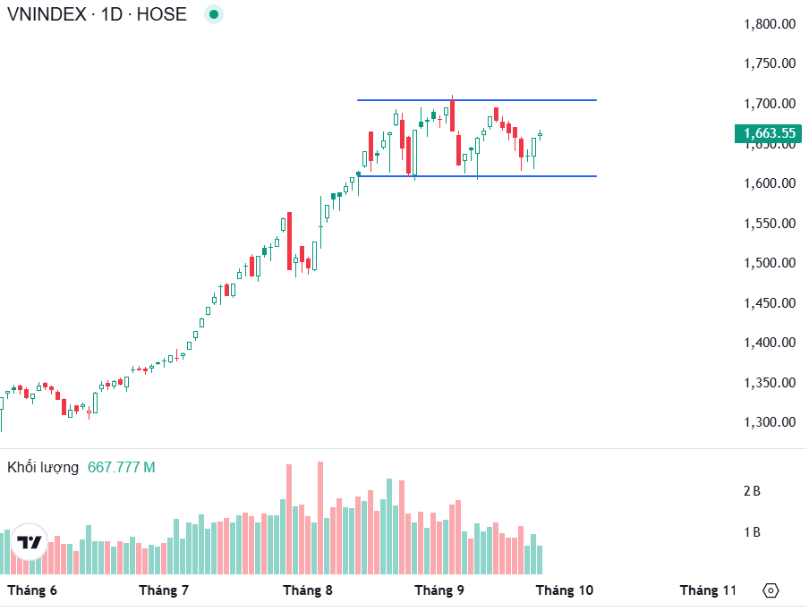 Hiện tại, VN-Index đã chuyển từ xu hướng tăng sang giai đoạn điều chỉnh – sideway, với vùng dao động dự kiến trong khoảng 1.600 – 1.700 điểm.