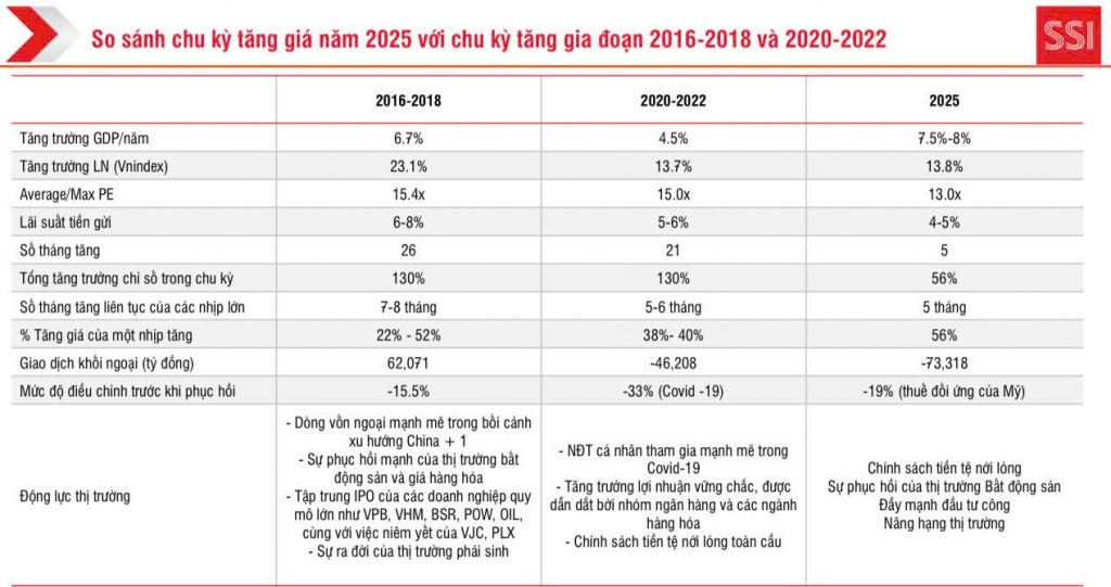 – Sóng 2025: Tháng 7–8/2025, thanh khoản đã đạt tới 40.000 tỷ đồng/phiên, con số vượt xa hai giai đoạn trước, tăng 100% với năm 2024. Tuy nhiên, đến nay, VN-Index mới chỉ tăng khoảng 25% từ nền giá cũ, thiết lập đỉnh mới ở vùng 1.700 điểm.